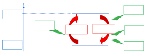 Le principe d’une cellule photoélectrochimique est indiqué ci-dessous. La lumière absorbée par le matériau semi-conducteur de l’anode (à gauche) crée des paires électrons-trou dans celui-ci. Les électrons sont amenés à la cathode (à droite) par le circuit électrique.