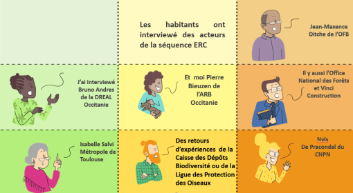 Consigne : Les habitants ont interviewé des acteurs de la séquence ERC. Ecoutez-les puis classez-les dans la typologie qui convient (Instruction et avis ou porteurs de projets et d'opérations, conseils et accompagnements). Liste des acteurs : Caisse des dépôts biodiversité, LPO, OFB, DREAL, métropole de Toulouse, Bureau d'études OXAO, Vinci Construction, ARB Occitanie.